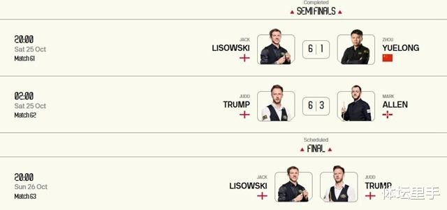 北京时间10月26日消息,2025斯诺克北爱尔兰公开赛结束了两场半决赛争夺,世界第8马克艾伦3-2后连丢4局崩盘3-6不敌特鲁姆普,中国名将周跃龙则是开场连丢4局1-6惨败利索夫斯基。
