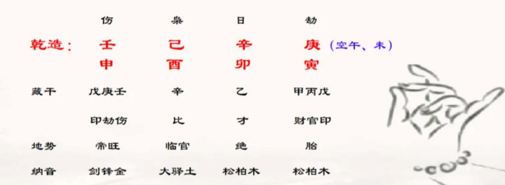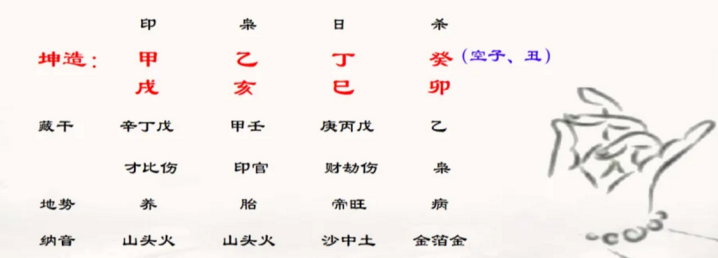 八字坤造:你生于甲戌年,乙亥月,丁巳日,癸卯时(日空:子丑)